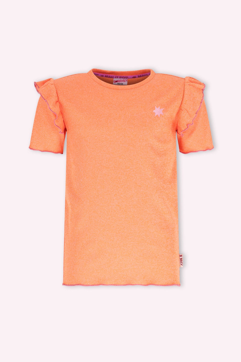 Voeg een vrolijke touch toe aan de outfit van je dochter met deze oranje top van B.Nosy! De zachte rib stof zorgt voor ultiem comfort, terwijl de roezel langs de mouw een speels detail toevoegt. Het leuke borduurtje op de borst maakt deze top een echte must-have. Perfect voor een fashionable en comfortabele look!
