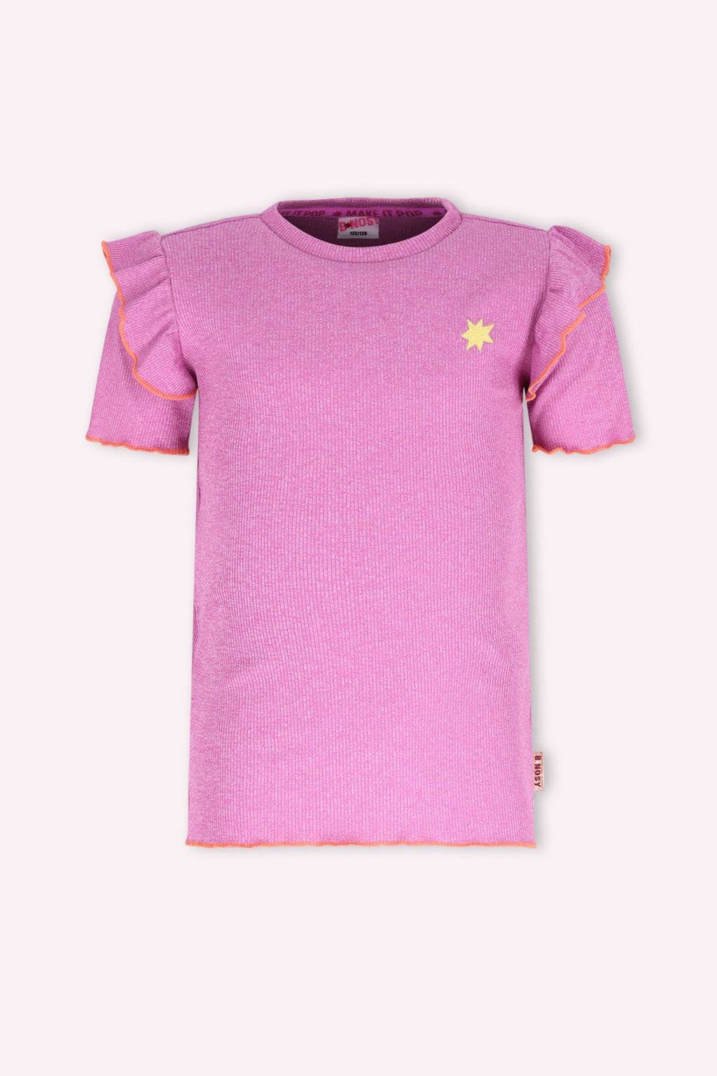 Deze trendy paarse top van B.Nosy is een echte kleurknaller voor je meid! De zachte rib stof voelt heerlijk aan en de roezel langs de mouw zorgt voor een speelse look. Het subtiele B.Nosy borduurtje op de borst maakt deze top helemaal af. Een onmisbaar item om te combineren met rok Rory of broek Phoebe voor een fashionable outfit.