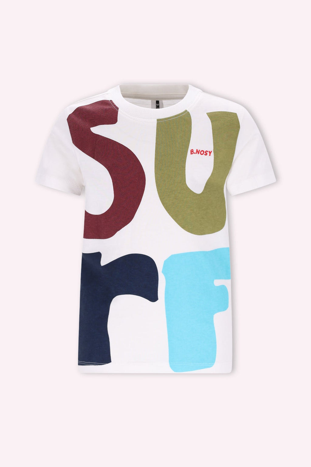 Dit super leuke T-shirt van B.Nosy is een echte must-have voor jongens. Het off-white shirt heeft een trendy SURF print met kleurrijke details. Gemaakt van 100% GOTS biologisch katoen, biedt het optimaal comfort. Combineer het met de korte broek Patty voor een hippe en speelse look.