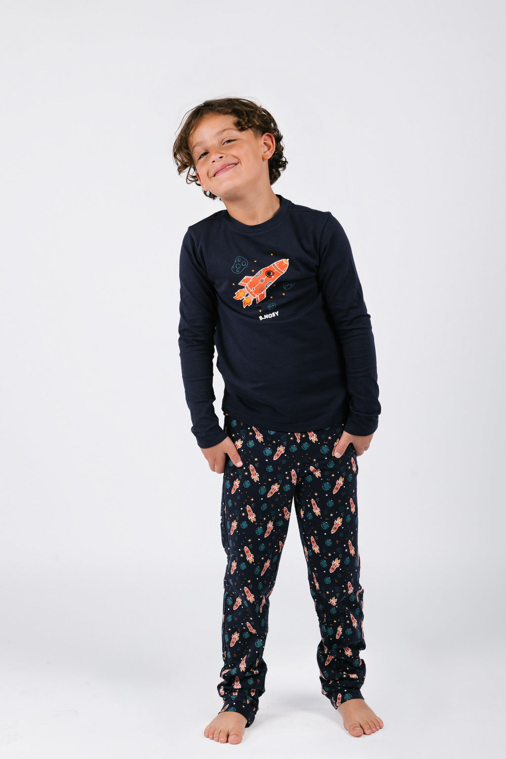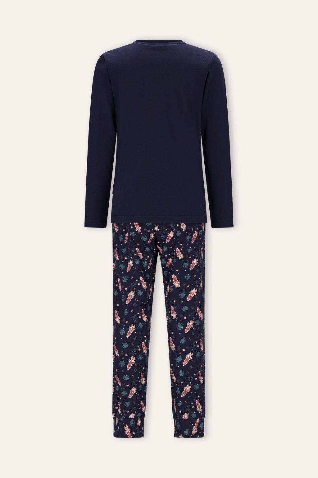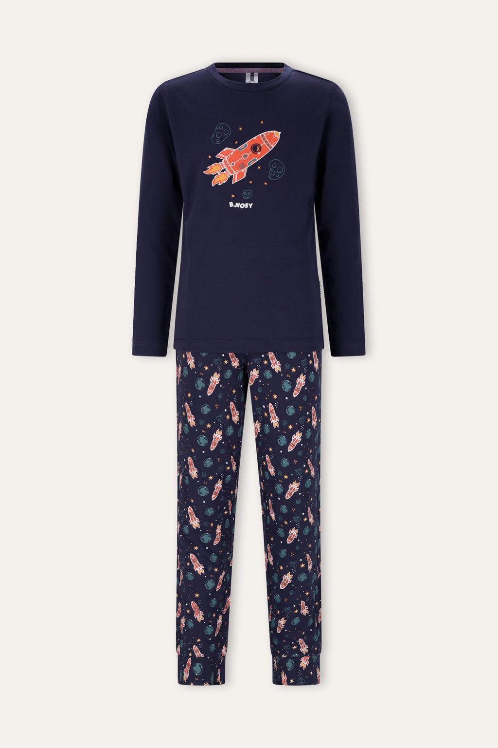 De B.Nosy Rocket Pyjama neemt je mee op ruimtereis in je dromen. De navy top met coole raketprint wordt gecombineerd met een broek vol planeten en raketten. Stoer, comfortabel en perfect voor kleine astronauten in de dop. Gemaakt van een zachte stof die heerlijk draagt. Scan de QR-code om de reis van het kledingstuk te ontdekken!